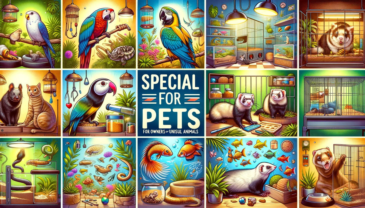 Экзотические домашние животные включают широкий спектр видов, каждый из которых требует уникального подхода. Рептилии, такие как черепахи, змеи и ящерицы, нуждаются в специализированных условиях содержания, включая контроль температуры и влажности. Птицы, включая попугаев и экзотические птицы, требуют большого пространства для полетов и социального взаимодействия. Мелкие млекопитающие, такие как хорьки, различные виды грызунов и ежи, нуждаются в безопасном пространстве для игр и активности.
