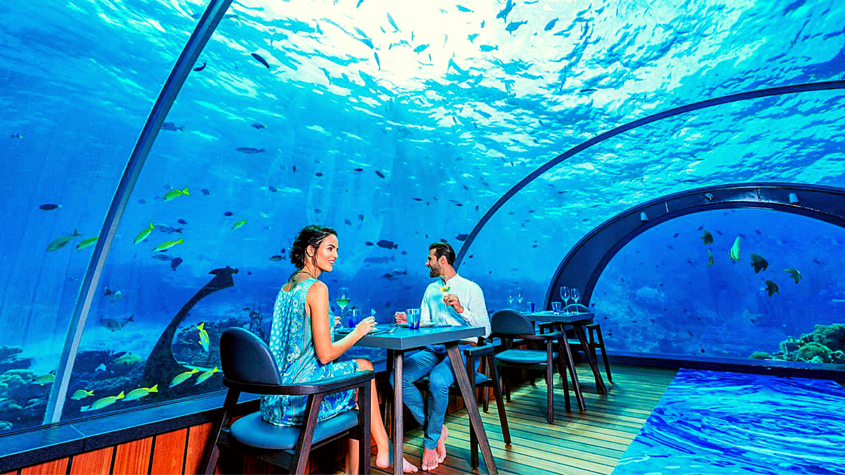 Богатые люди отдыхают в подводном ресторане. Премиум туры на Мальдивы. Рай на земле