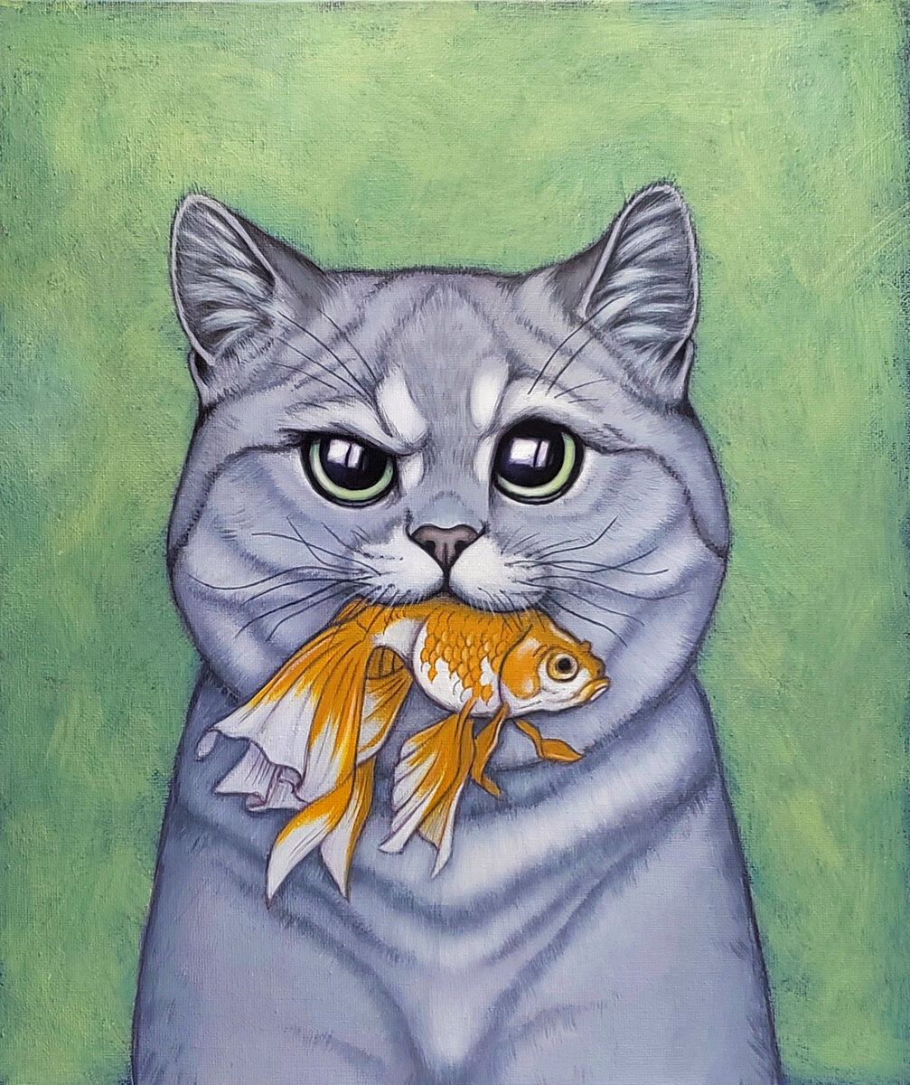 Приветствую всех гостей моего блога! В этом небольшом видео , которое имеет больше развлекательный характер, показано послойное нанесение краски. Тонкий слой, за слоем. Начала я эту работу с имприматуры, сделала ее теплой серой, среднего тона. Серым цветом я закрасила весь холст. Основной цвет котика. Использую теплые оттенки, так как они создают больше уюта в интерьере. Потом перенесла эскиз на холст с помощью акварельного карандаша. Я выбрала красный цвет, он хорошо заметен на сером. Акварельный карандаш смывается водой. Светлые участки шерсти я наносила немного разбавленным водой акрилом, послойно. Формат картины небольшой, поэтому лессировка не отнимает так много времени. В каждый последующий слой светлой шерсти, добавляется немного белил, тем самым создаётся эффект мягкого, "пушистого" перехода. На Серый фон я нанесла приглушенный фиолетово-сиреневый цвет (достаточно темный), в 2 слоя ( акрил не ложится идеально с первого слоя). Потом, на уже фиолетовый фон, нанесла цвет "Шалф