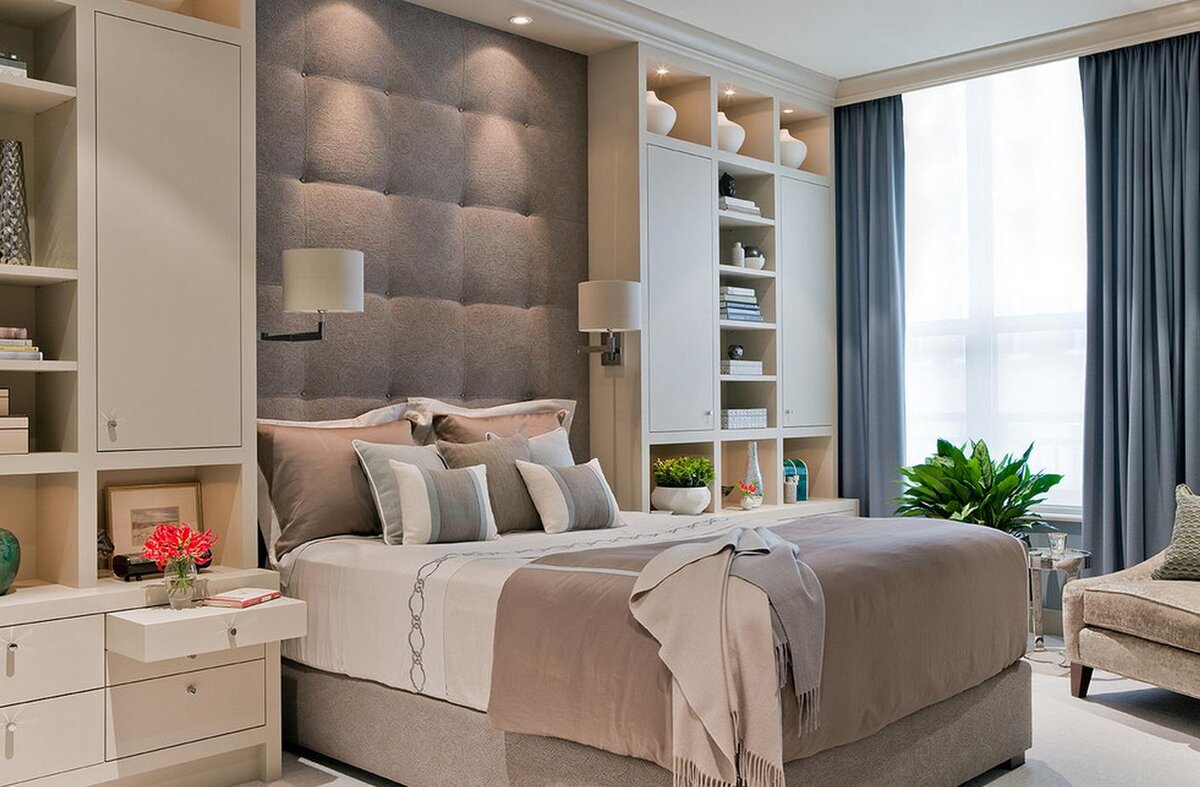 - Подвесные консоли вместо тумбочек: Освободите пол с помощью подвесных консолей или полок вместо традиционных тумбочек. Альтернативой может быть ниша арочной формы, добавляющая интерес к интерьеру.