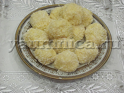 Многие из нас любят конфеты Рафаэлло. И не секрет, что они действительно очень вкусные. Правда, не всегда бывает возможность их купить, когда хочется. Я тоже люблю такие конфеты. И, как-то, просматривая рецепты десертов, я наткнулась на один рецепт приготовления Рафаэлло в домашних условиях. Сохранив у себя предложенный рецепт, через время я попробовала сделать эти конфеты самостоятельно. Конфеты получились оригинальными и вкусными. Чтобы приготовить этот десерт, для начала подготавливаем все ингредиенты, необходимые для его приготовления: одна банка натурального сгущенного молока, пять пачек по 25 г неокрашенной кокосовой стружки, 120 г свежего масла сливочного, один стакан миндаля. 1. Берем четыре пакетика кокосовой стружки и высыпаем в глубокую миску. Берем именно неокрашенную стружку. Цветная стружка для приготовления конфет не подойдет. Один пакет стружки нам будет нужен для присыпки. 2. В миску с кокосовой стружкой кладем предварительно размягченное масло сливочное. Можно поре