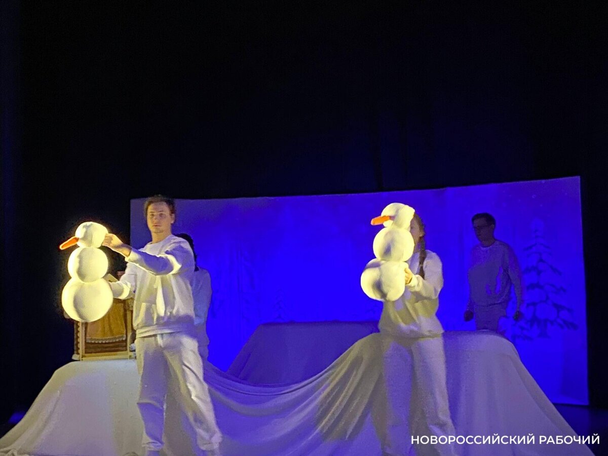 Состоялась премьера новороссийского кукольного театра «Первосказ» Актеры (и даже куклы) волновались, но зрителю это не было заметно. Теплая и добрая история про Ёжика, Медвежонка и Снеговиков не оставила равнодушным ни одного зрителя. Зимняя сказка отлично вписалась в контекст нашего недавнего снегопада – такого же кратковременного, как в спектакле. Особенно малышам понравился интерактив – вместе с артистами они «лепили снеговиков», сначала разогревая ручки, потом формируя снежки, а потом – р-раз, и волшебным образом на сцене оказывался красивый и округлый снежный ком. Впрочем, понятие сцены в кукольном театре было размыто. Актеры находились в одном пространстве с детьми. Маленькие зрители сидели на ковровом покрытии на полу на уютных подушечках, некоторые родители тоже воспользовались такими местами. Как во время переменчивых новороссийских зим, снеговики быстро растаяли. Но осталось чудесное ощущение волшебства. Дети, желая продлить праздник, не хотели уходить. Они активно фотографир