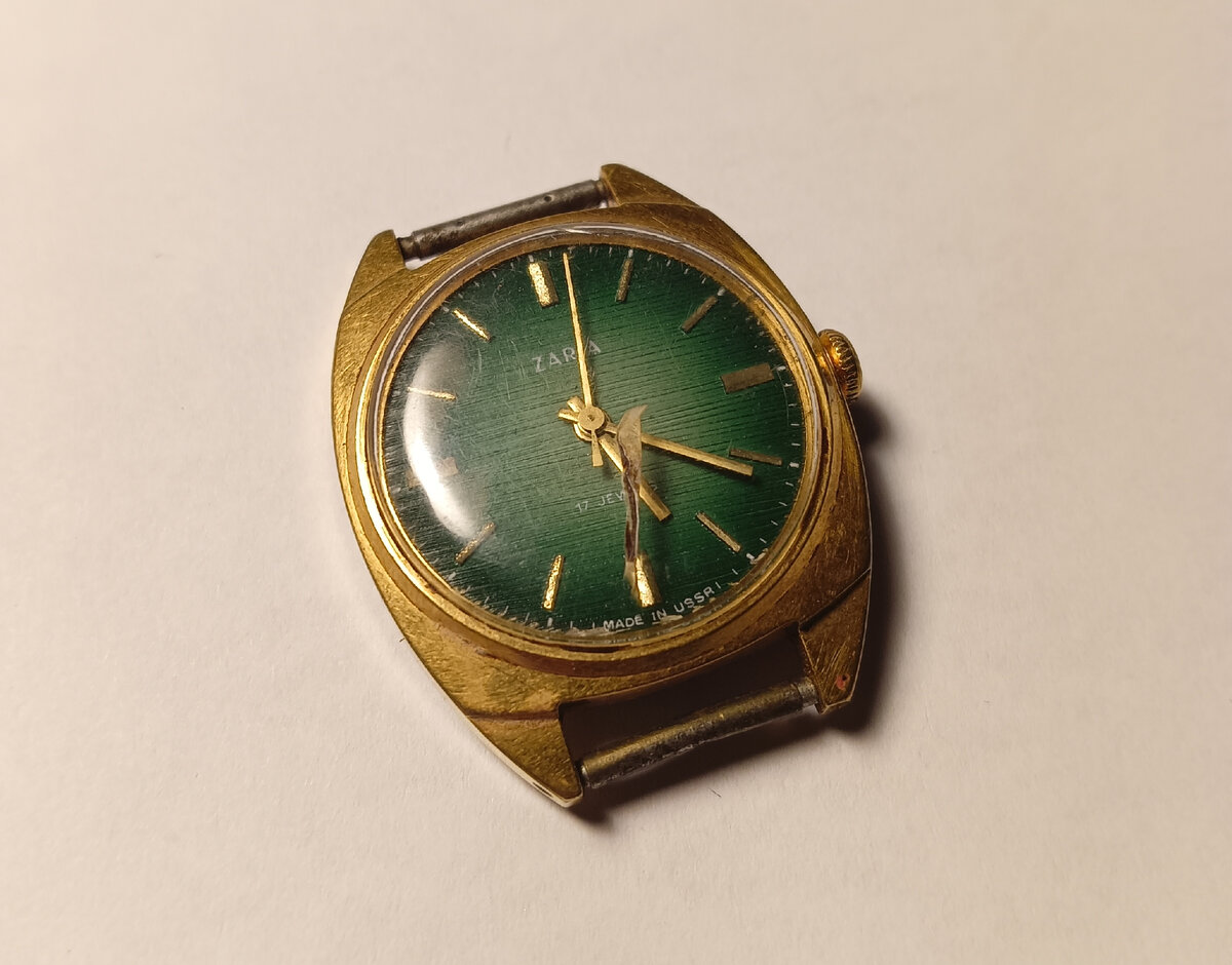 Доброго времени суток! В ремонт принесли женские часы Заря, довольно редко такие часы сейчас попадают. Часы не идут, завод полный, стекло разбито. Открыл крышку, под основной крышкой есть еще одна защитная. Вывалился камень баланса, либо от удара он выпал, либо его кто то выковырнул. На задней крышке следы ржавчины, но вроде в механизм вода не попала. Снял стрелки, циферблат у часов интересный, цвет красивый и в рубчик. Решил вначале заняться балансом, выпавший камень не держится в мосту, думаю буду менять мост. Нашёл целый мост, спираль немного деформирована по плоскости, но получилось выправить. Баланс готов. Разбираю механизм, он очень нуждается в мойке. Промыл и смазал пружину. Собрал механизм, смазал все цапфы - ход хороший. Установил новое стекло - без клея, подошло отлично с небольшим натягом захлопнулось. Заменил изношенную головку, запчасти к Заре у меня есть. Довольно симпатичные часики получились, уж выглядят точно оригинально. Всем удачных ремонтов!