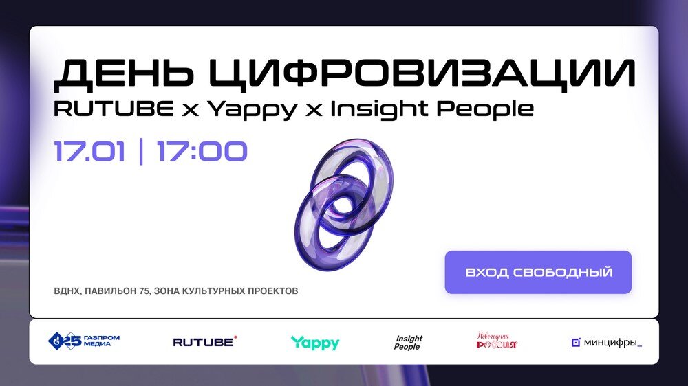 День Цифровизации Минцифры РФ пройдет 17 января на ВДНХ в рамках выставки-форума «Россия». 17 января в 17:00 в рамках Дня Цифровизации Минцифры России при поддержке компаний «Газпром-Медиа Холдинга» — платформы RUTUBE, приложения вертикальных видео Yappy и продюсерского центра «Инсайт Люди» — стартует развлекательная программа, в которой примут участие известные артисты и блогеры. Каждый желающий сможет стать участником всероссийской акции, организованной «Газпром-Медиа Холдингом» по всей стране: от Калининграда до Владивостока. Для участия во всероссийской акции «Газпром-Медиа Холдинга» необходимо снять ролик и опубликовать его в приложении вертикальных видео Yappy или на платформе RUTUBE с хештегом #хочунабольшойэкран. Лучшие видео попадут на медиафасад здания института «Гидропроект» — самый большой вертикальный экран Москвы.