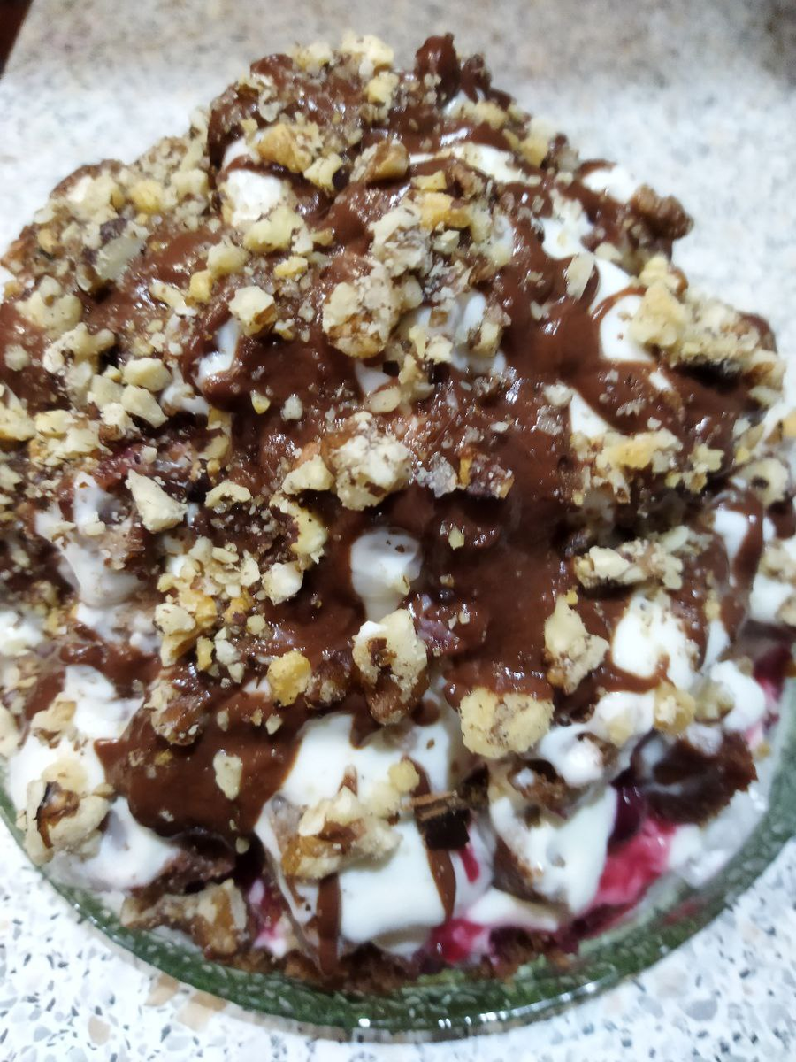 Выкладываем круглую основу на блюдо, промазываем хорошо кремом, выкладываем слой вишен (1,5-2 ст. ложки), бисквитные кубики обмакиваем в крем и укладываем горкой, при этом добавляем слои вишни. Остатки крема выкладываем на тортик.