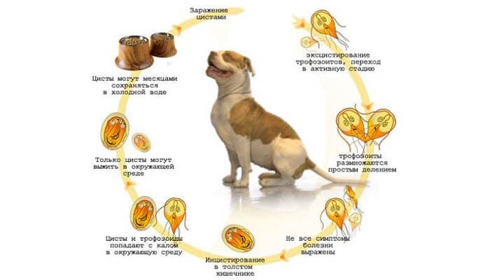 Лямблиоз — кишечная инфекция человека и животных, вызываемая микроскопическими простейшими. Лямблия (Giardia duodenalis) - это одноклеточный паразит, а не бактерия или вирус. Такой паразит встречается практически во всем мире и является частой причиной диареи. Людей это заболевание даже получило название «диареи путешественников», так как оно часто возникает у любителей активного отдыха, которые случайно потребили загрязненную лямблиями воду. У собак лямблии тоже могут быть причиной заболевания, однако, у большинства собак, зараженных лямблиями, нет диареи, рвоты или каких-либо других внешних признаков заболевания. Трофозоиты лямблий обитают в просвете кишечника на поверхности эпителия, где прикрепляются к его ворсинкам. В конечном итоге из трофозоитов формируются неподвижные формы — цисты, которые в дальнейшем выделяются с калом. Препатентный период лямблиоза у собак колеблется от 4 до 12 дней (средняя продолжительность — 10 дней). Лямблиоз может передаваться при употреблении зараженн