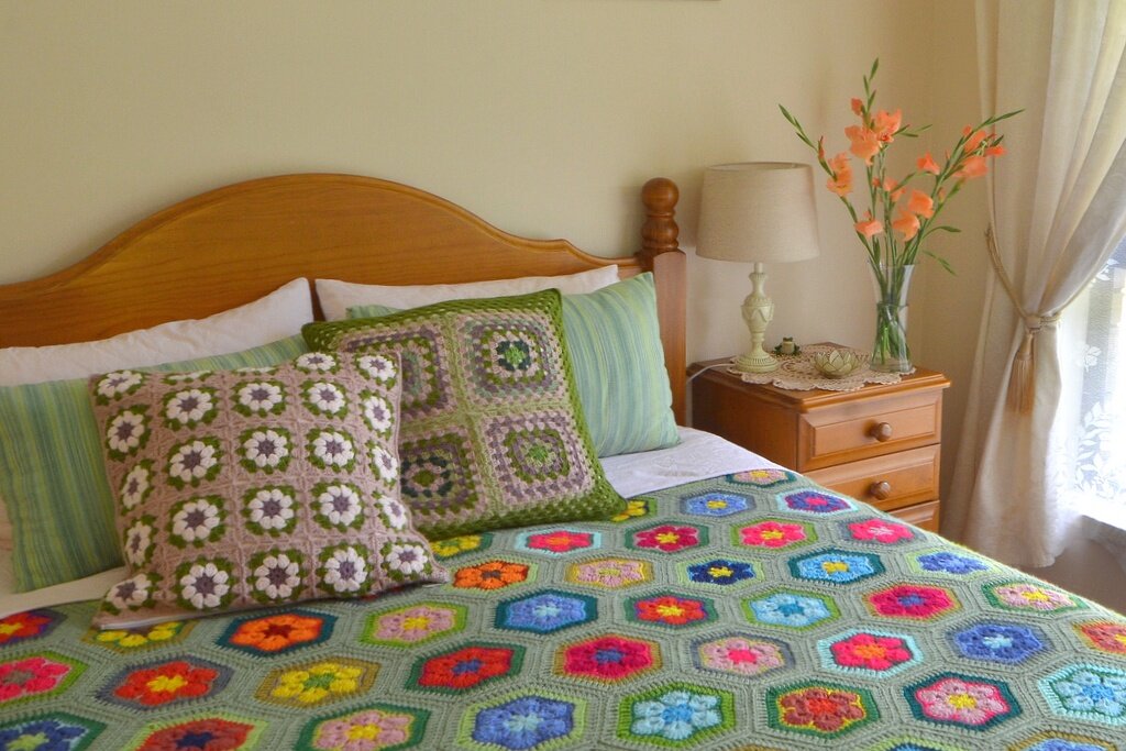 И :) не ошиблась! Мне до сих пор по утрам очень приятно расправлять на кровати это серовато-зелёное покрывало с яркими цветами. А когда плед мне всё-таки надоест, я достану из шкафа следующий. 😁