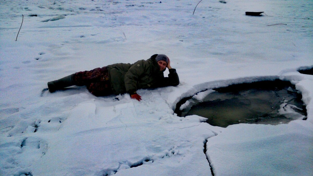 Тогда, стараюсь перенести центр тяжесть вперед, на грудь вылезти, но только я начинаю облокачиваться на лёд, он ломается подо мной! Тонкий ледок...