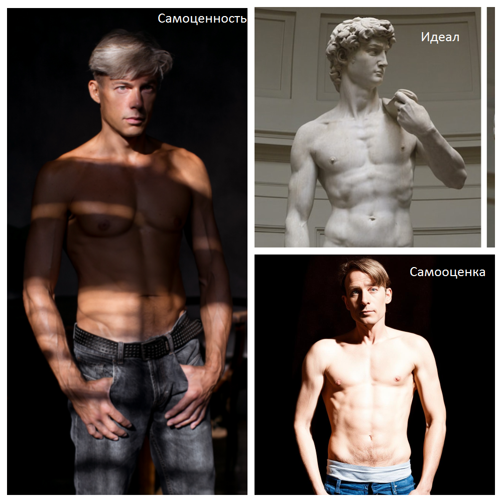 Первый - это сравнение себя с идеалом. Тут человек терпит фиаско и получает сплошные разочарования. Идеал всегда лучше, умнее, красивее, круче, богаче, притягательнее, успешнее и пр. Самооценка страдает, появляются недостатки и необходимость побороть их.