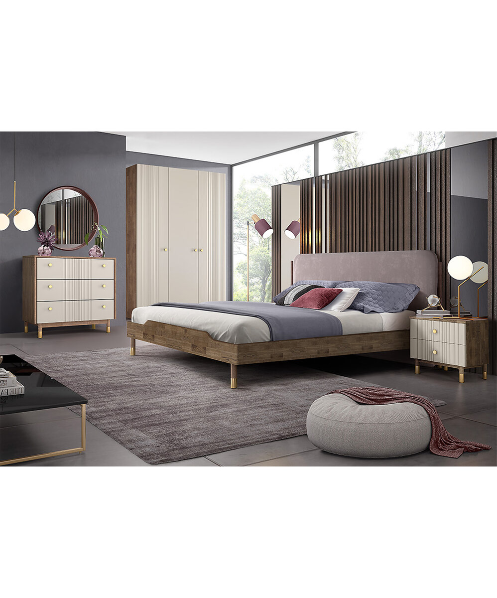 Совершенство в деталях: минималистичные формы, высокие ножки, волнообразные фасады, имитирующие драпировку атласной ткани, минималистичная позолоченная фурнитура. Сочетание текстурного массива дуба и фрезерованных фасадов ультрамодных пастельных тонов позволяют использовать коллекцию для создания самых разных интерьеров, и позволяют воплотить самые смелые идеи.