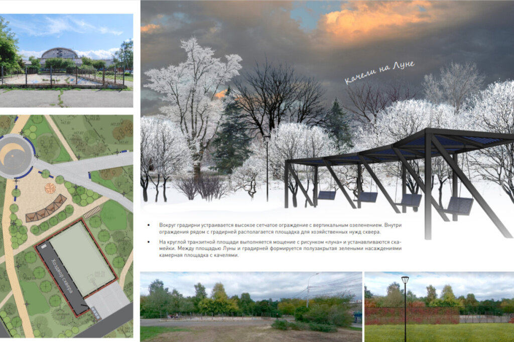Появится площадь с «трамваем». Там установят павильон, стилизованный под вагон, и проведут мощение с укладкой «рельс». Вокруг заброшенной градирни сделают высокое сетчатое ограждение с вертикальным озеленением. Расположенную рядом круглую транзитную площадь украсят плиткой с рисунком «Луна». Между двумя этими объектами обустроят камерную площадку с качелями.
