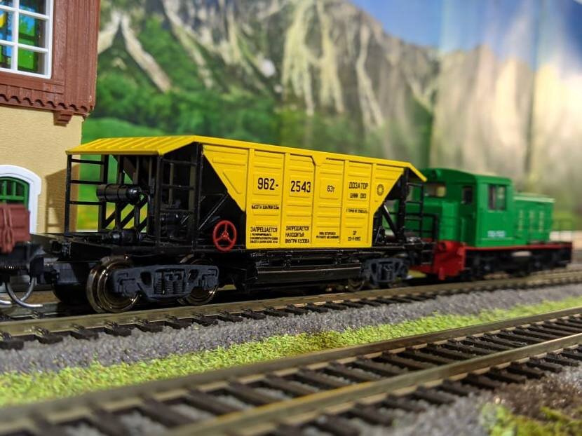 Модель вагона, выполненная в масштабе 1:87, построена из набора для самостоятельной сборки производства 3D maker Ekb Евгением Ширшовым из г. Воронеж. Данный набор примечателен тем, что полностью изготавливается методом 3D печати. При этом основная деталь включает в себя кузов с рамой и разгрузочными устройствами. Из дополнительных навесных деталей - тормозное оборудование и оборудование для проведения разгрузки. В процессе сборки модели самое главное - соблюдать аккуратность. Модель содержит множество тонких ажурных деталей, лестниц и т.д. Но в целом сборка модели довольно таки простая, чего не скажешь о покраске. Покрасить такие дозаторы можно по-разному, но классическим вариантом для них считается двухцветный черно-желтый. Рама и разгрузочные устройства в таком случае окрашиваются в черный цвет, а кузов - в желтый. Надписи выполняются как правило черным цветом. Трудоемкость такого варианта окраски заключается в том, что необходимо использовать довольно сложные маски, и большая часть