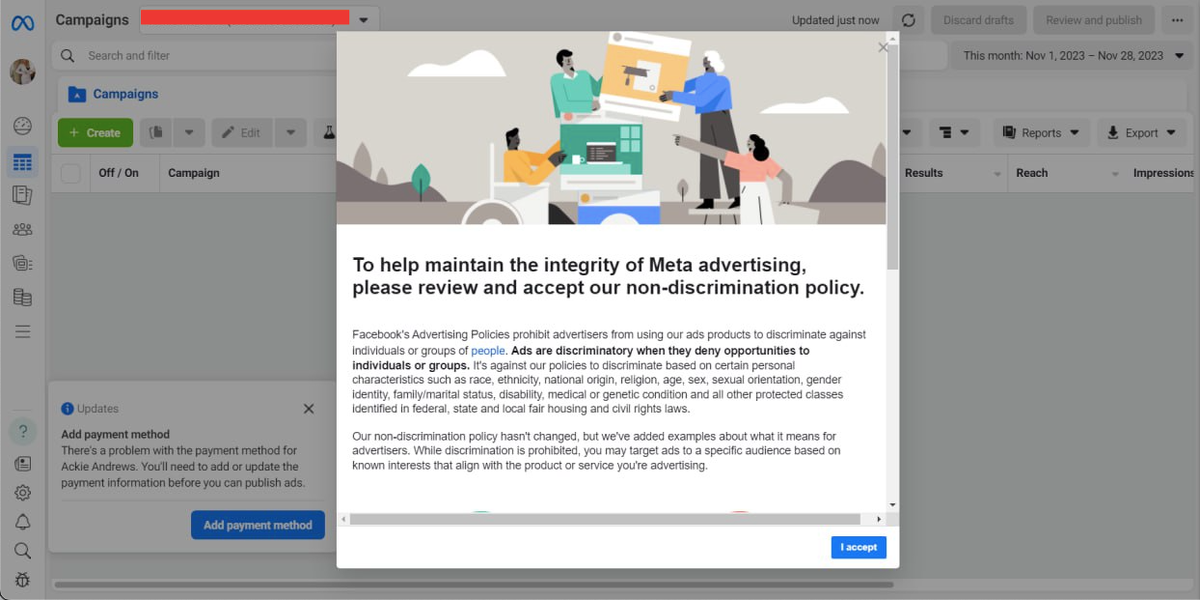 Переходим по ссылке https://www.facebook.com/adsmanager/manage/campaigns и принимаем политику Facebook.