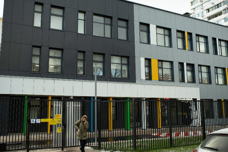 Трёхэтажное стильное темно-серое здание с яркими, разноцветными панелями и колоннами – так выглядит новый корпус школы на ул. Академика Анохина, д. 40/2, корп. 2. Он построен по индивидуальному проекту.