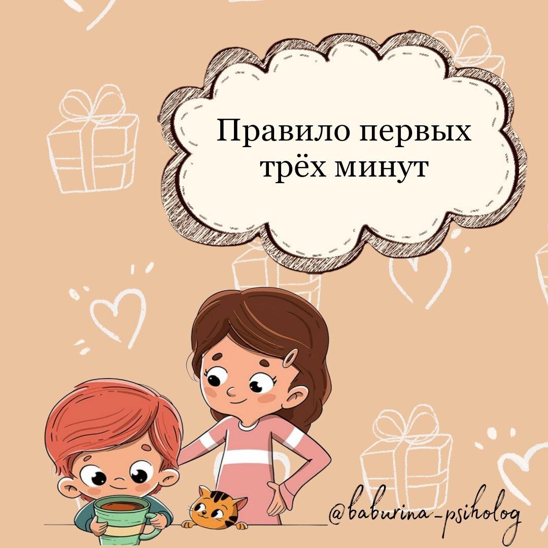 «Правило первых трех минут» — простое, но очень важное правило, которое помогает улучшить отношения с ребенком и сделать их более теплыми и доверительными. Суть этого приема в том, что даже после непродолжительной разлуки с ребёнком нужно сразу после встречи опуститься на уровень его глаз и спросить, что с ним происходило, пока вы отсутствовали. После этого очень внимательно выслушать всё, что он говорит, глядя ему в глаза и ни на что не отвлекаясь. Чаще всего именно в самые первые минуты после встречи ребёнок рассказывает всё, что накопилось за день или за время вашего отсутствия. 3 минуты – это условный временной отрезок. Кому-то может понадобиться и немного больше (возможно это будет 7- 10 минут чтобы выговорится, а кто-то уложится и в 1-2 минуты). Дело в том, что именно в эти первые минуты ребёнок чувствует, как он важен для вас. Порой эти минуты важнее целого дня, проведённого вместе. Не забывайте об этом правиле, возвращаясь с работы, забирая ребёнка из школы, детского сада ил