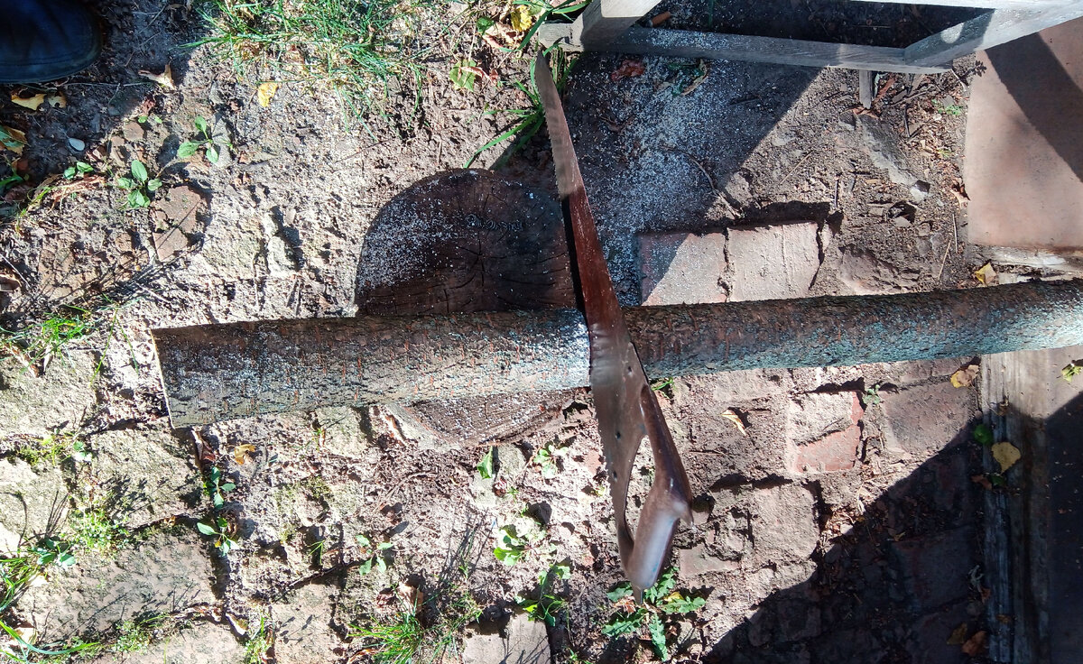Тогда же, во время отпуска и приступаю к изготовлению. Из подходящего материала имеется стволик от вишни, продукт санитарной рубки – спиленный во время (или «во имя»?) благоустройства дворовой территории. Отпиливаю кусочек длиной около 35 сантиметров – этой длины будет вполне достаточно для ложки нужного функционала.
