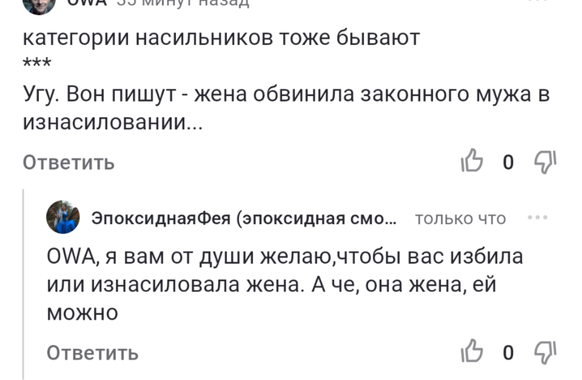 Я уже не представляю, как можно написать культурно то, что я думаю ,не подпадая под цензуру. Почему люди вообще такие вещи себе позволяют? Надеюсь от всей души, что однажды всем тем, кто рассуждает подобным образом , что «раз семья, то насилия не может быть» встретится человек сильнее их физически…ну и по праву сильного тоже решит, что может сделать с ними всё, что захочет.