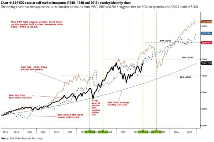 По мнению Стивена Саттмайера из Bank of America, нынешний долгосрочный бычий рынок акций может продлиться до 2033 года. Он выделил предыдущие бычьи рынки и использовал их в качестве дорожной карты для построения сегодняшнего ралли. Прорывы векового бычьего рынка S&P 500 (1950, 1980 и 2013 годы). Месячный график. Наложение графика, которое отображает прорывы векового бычьего рынка в 1950, 1980 и 2013 годах, предполагает, что SPX может провести большую часть 2024 года выше 5000 пунктов. Источник: BofA, Bloomberg Согласно недавнему заявлению технического стратега Bank of America Стивена Саттмайера, нынешний бычий рынок акций может продлиться до 2033 года. Он наблюдал за предыдущими вековыми бычьими рынками акций США с 1950 по 1966 год и с 1980 по 2000 год, а затем использовал их в качестве дорожной карты для построения графика текущего ралли. «Чтобы знать, куда вы идете, полезно знать, где вы были», — сказал Саттмайер в видеообращении к клиентам. Нынешний бычий рынок официально начался в