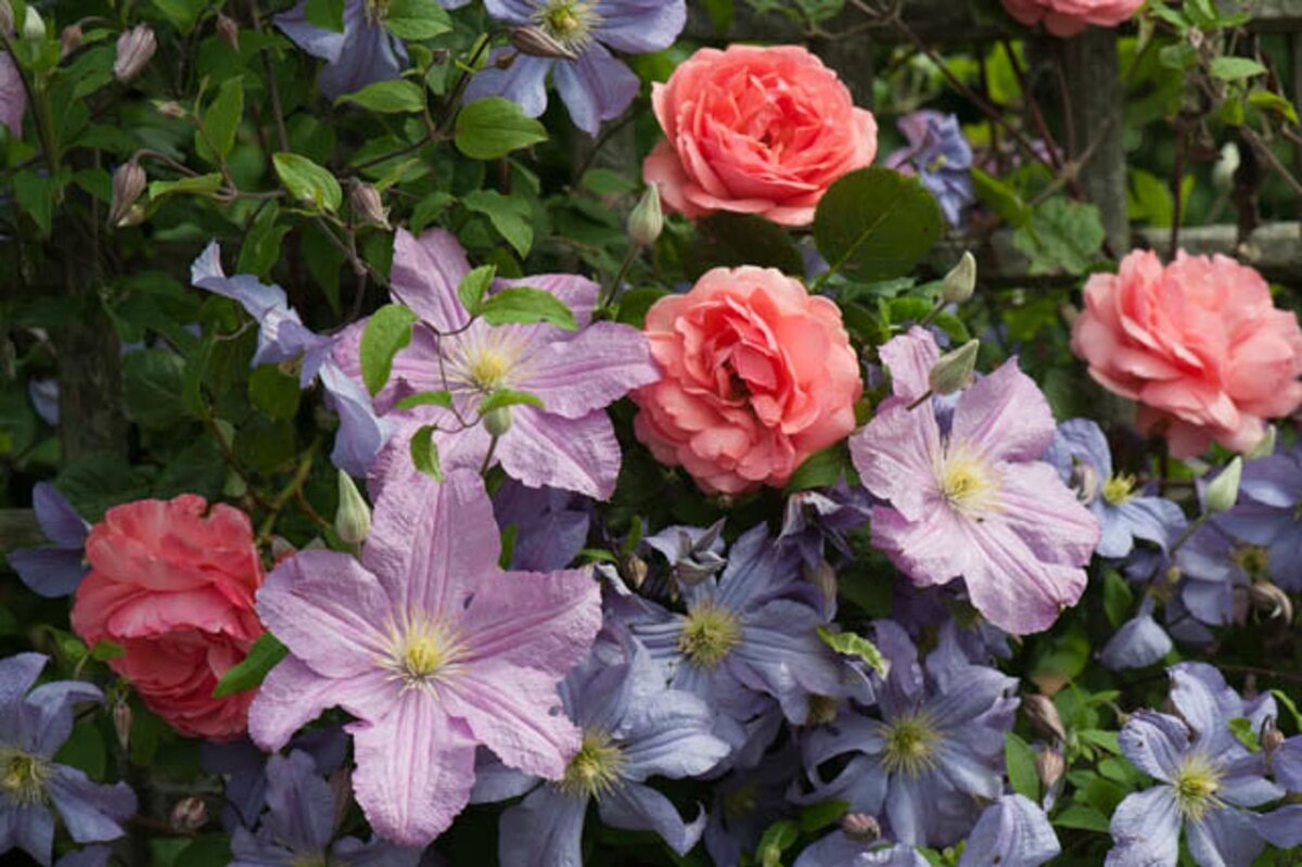 Сорта клематисов, такие как "Warszawska Nike" и "Star of India", прекрасно сочетаются с разнообразными оттенками роз, от белых и кремовых до алых и пурпурных.