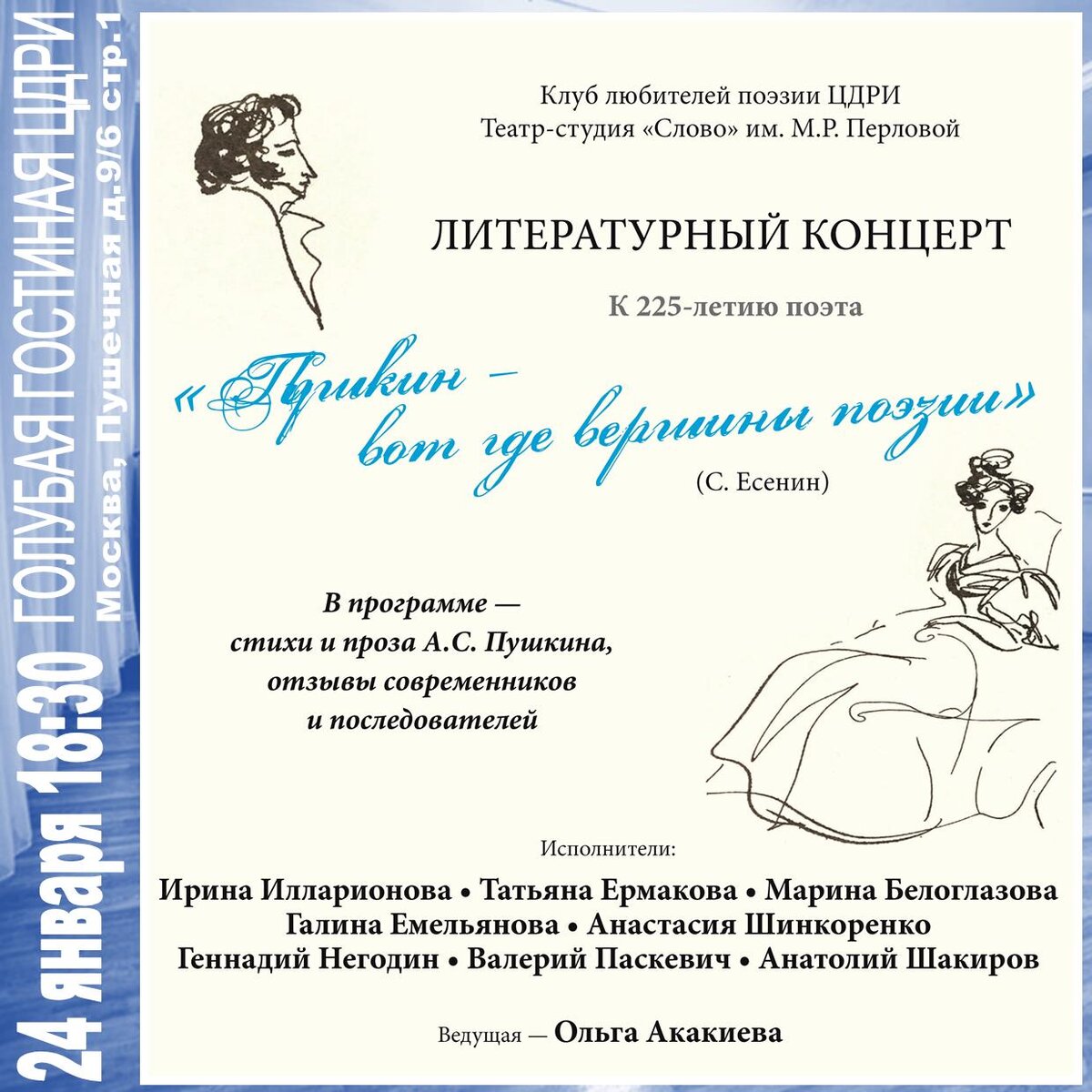 Литературный концерт к 225-летию поэта Клуб любителей поэзии ЦДРИ и Театр-студия «Слово» им. М.Р. Перловой В программе — стихи и проза Александра Сергеевича Пушкина, отзывы современников и последователей. Исполнители: