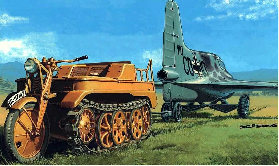 История его создания начинается в 1940 году, когда компания NSU получила заказ от Министерства вооружений Германии на проектирование легкого полугусеничного тягача с грузоподъемностью полтонны. В Европе вовсю уже шла война и Гитлеру нужны были высокомобильные механизированные части. А в данном случае, предполагаемые небольшие размеры и вес тягача, позволяли использовать его при воздушно-десантных операциях. Концепция тягача в виде совмещенного мотоцикла и трактора была предложена Г. Книпкампом. Довольно выдающимся инженером - изобретателем. Ходовая часть тракторной половины, если так ее назвать, состояла из расположенных в шахматном порядке катков и, в дальнейшем, стала прообразом для оснащения подвески знаменитых "Тигров" и "Пантер". В том же 1940 году опытный образец вышел на испытания. Результаты его вполне удовлетворили заказчика и симбиоз мотоцикла и трактора приняли на вооружение.