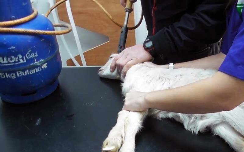 Ограничьте движение козленка (голова фиксируется недоуздком или специализированным холодным ограждением);