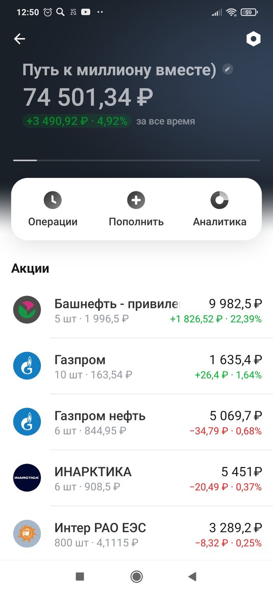 Доброго времени суток господа инвесторы! Сегодня 17 января, и у меня очередное пополнение счета. Пополнение составляет шесть тысяч рублей. На мой взгляд торговля в этом году идёт довольно неплохо, мой портфель вышел в неплохой плюс в моменте было 5%.А по акции $BANEP Башнефть привелегия рост больше 20%, что очень приятно. А также пришли дивиденды от $MGNT Магнита десятого была отсечка и 15.01 уже поступили на счёт, очень оперативно 👍. (Скрины внизу) Итак перейдем к покупкам как и писал ранее , что буду докупать после отсечки акции от которых должны прийти дивиденды. $SIBN Газпром нефть - 1шт отсечка была 27.12.23 но ещё не поступали, кто-то писал, что в двадцатых числах должны прийти. Потихоньку докупаю на будущее. $ROSN Роснефть - 2шт купил сразу после отсечки, её покупаю постоянно по чуть-чуть постоянно. Считаю что потенциал у Роснефти ещё большой. $FLOT Совкомфлот - 1 лот докупил жду роста и хороших дивидендов в этом году. $TATN Татнефть - 2шт докупил после отсечки одна и