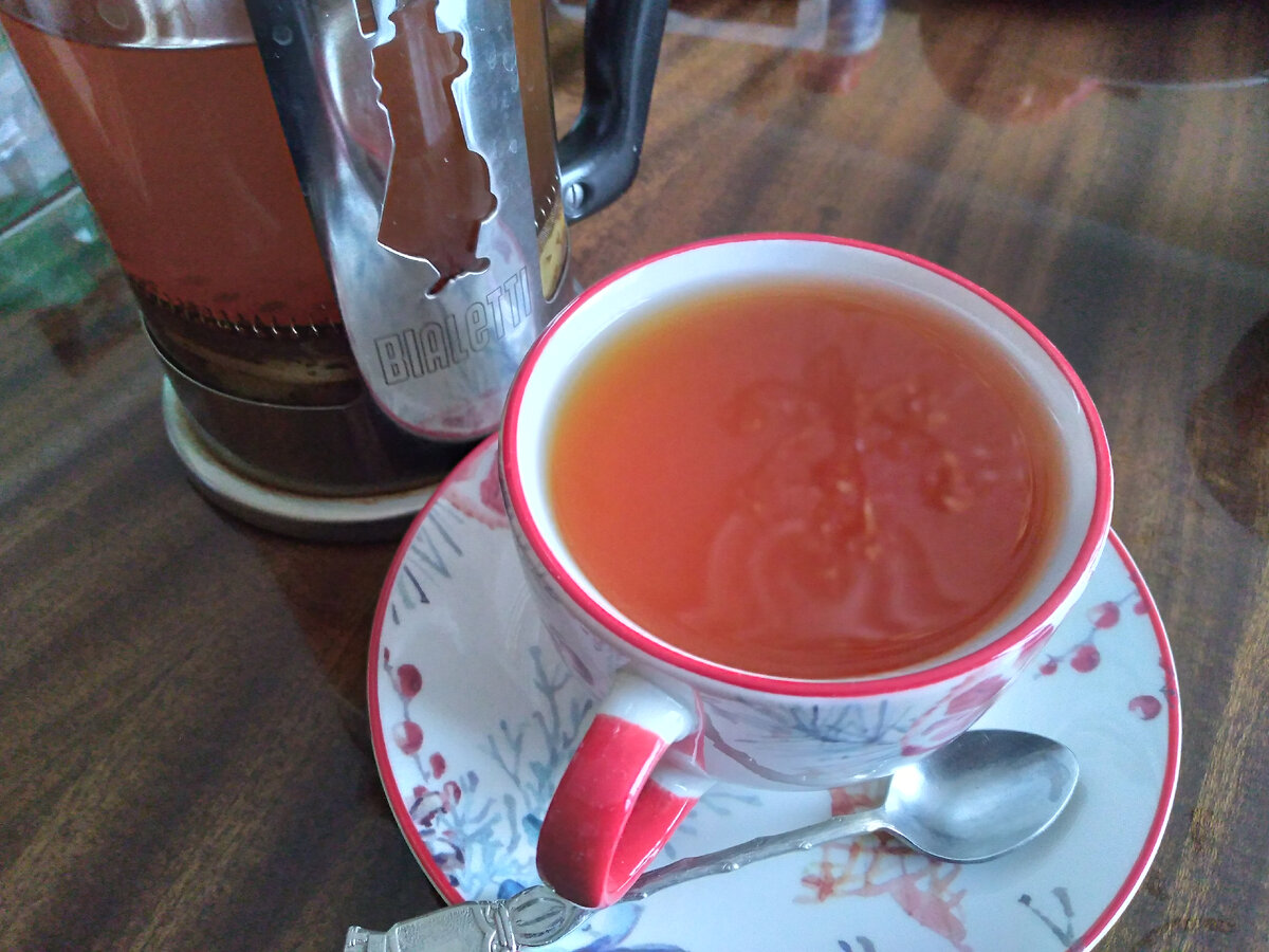 Данное сочетание сделал чисто интуитивно и так всем дома понравился этот чайный напиток, что теперь завариваем его постоянно. Очень хорош зимой, подходит для завтрака, полдника и даже вечернего чаепития. Для этого нам понадобится: Минеральная бутилированная вода Архыз или, на худой конец, Сенежская – 800-1200 мл Яблоко крипс Пинк - 1/3 Лимон с цедрой - одна долька Грейпфрут- 3,4 дольки, без кожуры, только мякоть, иначе будет сильно горчить и все испортите Чабрец - на кончике чайной ложки Чай чёрный Чай завариваю в большом френч-прессе объёмом 1 л, когда чайник закипает, то обдаю горячими парами френч-пресс, стекло нагревается и обеззараживается высокой температурой. Насыпаю чёрный чай, чабрец, яблоко режу очень тонкими слайсами, а затем на мелкие квадраты поперёк, принцип такой - чем меньше кусочки яблока, тем быстрее они отдадут все свои соки и вкус. Добавляю лимон и грейпфрут. Температура в чайнике конечно же сразу спадает, поэтому я сначала заливаю кипятком френч-пресс лишь наполови