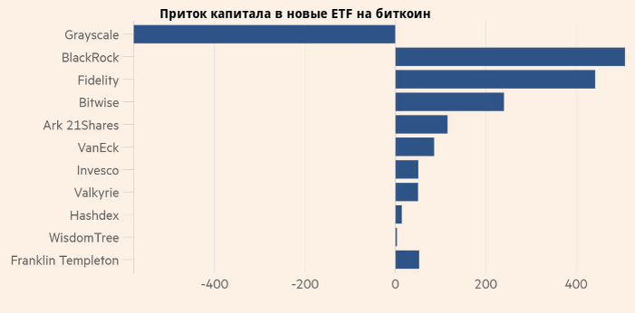 Инвесторы забрали из фондов Grayscale $579 млн и переложили их в новые криптопродукты от BlackRock и Fidelity Источник: The Finnacial Times Биржевые фонды биткоина привлекли чуть менее $1 млрд долларов в первые два дня торгов: инвесторы осторожно пробуют новые инструменты фондового рынка, привязанные напрямую к криптовалюте. По данным управляющего цифровыми активами CoinShares, фонды, в том числе BlackRock, Franklin Templeton и Invesco, с момента запуска в четверг в совокупности привлекли активы на сумму $984 млн. BlackRock, крупнейший в мире управляющий активами, лидирует с притоком в размере $508 млн, за ним следует Fidelity — фонд привлек $442 млн. На прошлой неделе криптоэнтузиасты праздновали решение Комиссии по ценным бумагам и биржам (SEC), которая одобрила запуск 11 спотовых ETF на биткоин. Сторонники надеются, что это привлечет на крипторынок новых инвесторов, а его стоимость вырастет в долгосрочной. С октября 2023 года, в ожидании решения SEC, биткоин подорожал более чем на