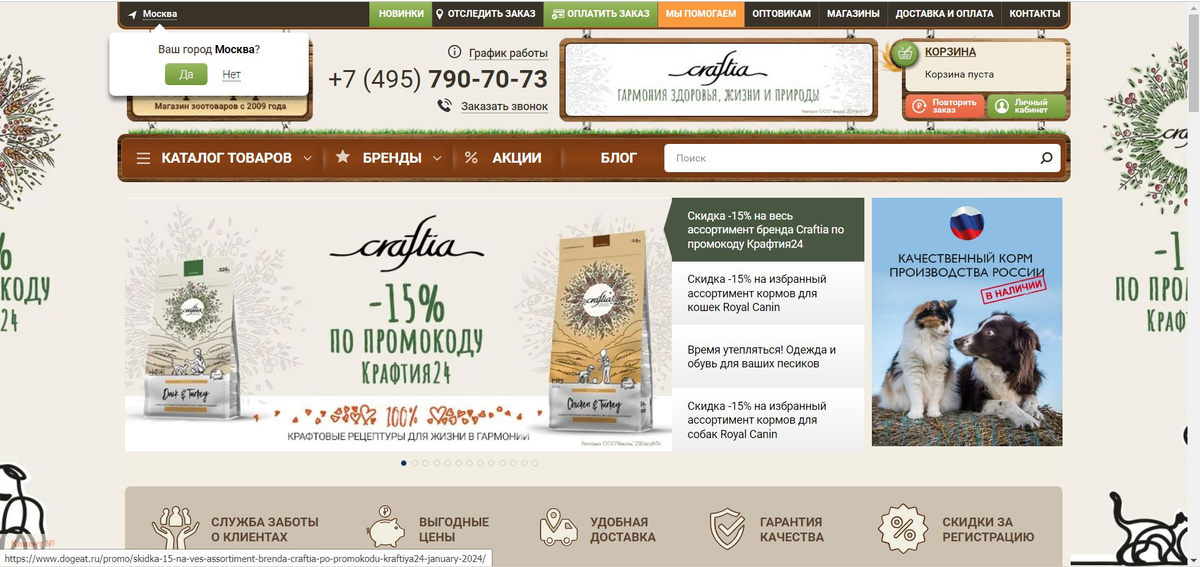 На главной странице публикуются сведения о промо-акциях. Доставка по Москве и ближнему Подмосковью собственной курьерской службой, 7 дней в неделю.