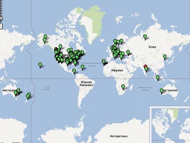 Сеть береговых базовых станций системы Winlink. Зеленым отмечены действующие станции, желтым - временно не работающие. Две станции находятся на территории России - на Урале и на юге нашей страны