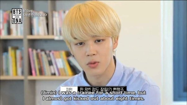 Его почти выгоняли, потому что он недостаточно хорошо танцевал в стилях хип-хоп. Он поделился этим на презентации во время промоушена Love Yourself: Her . Я был стажером очень недолгое время, но меня чуть не выгнали из команды примерно 8 раз. Ви сказал что-то вроде того, что Чимина чуть не выгнали 15 раз. И Шуга спросил, не выгнали ли его за день до дебюта. Это звучит смешно, потому что мы знаем, насколько он великолепный танцор. Но он изо всех сил пытался перейти от современного стиля к стилям, используемым в к-поп (и он был стажером менее года - времени на переход было не так уж и много). Мне почти не удалось попасть в команду, потому что я недостаточно хорошо танцевал. Моей специальностью был современный танец. Поскольку хореография айдолов настолько отличается от того, к чему я привык, мне было трудно. Он сказал, что даже Джин не думал, что продержится долго в BigHit. Чимин на самом деле научился танцевать в 8-м классе. Позже он поступил на факультет современного танца в старшей шк