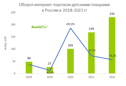 В 2022 г оборот интернет-торговли детскими товарами в России вырос на 36% и составил 231 млрд руб.
