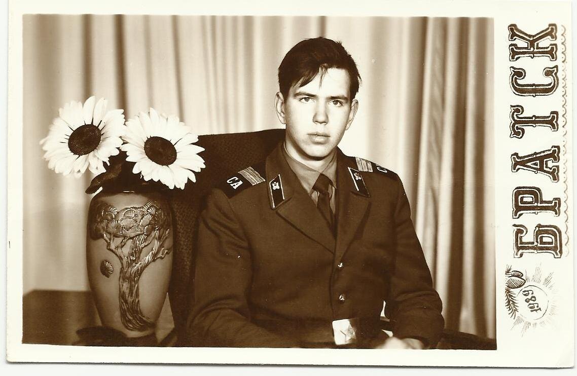 Студийная фотография сержанта автомобильных войск в парадной форме одежды образца 1969 года. На парадном мундире пришиты погоны образца 1973 года (на погонах этого образца буквы «СА» выполнены из ПВХ-плёнки) с сержантскими нашивками из металлизированного галуна. На лицевой стороне фотокарточки указанно место и дата съёмки в фотоателье – «Братск 1989». На обратной стороне снимка также имеется подпись: «Лучшему другу из Иркутска Николаю на память о днях службы в арт. отделе нашего славного ТУЦа [территориального учебного центра – примечание автора]. Твой разводящий ещё год охраняет тебя и твою подругу! Игорь. 10.06.89 г. Братск-12 в/ч 30736». Фото из семейного архива Николая Лузгина, подписчика канала. Если Вы хотите поделиться своими фотографиями 1930-1990 годов – присылайте их на почту istorikmoskalev@mail.ru и они будут опубликованы на канале