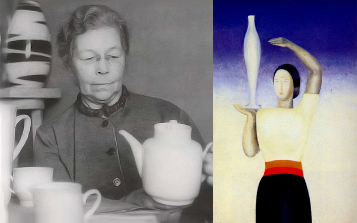 Ей нравилось создавать изящные, архитектоничные вазы светлых оттенков (особенно она любила белый), геометризованные чайные сервизы, выстраивать «мостик» между народным искусством, авангардом и классическим фарфором. Исследователи называли ее стиль скорее неоклассицизмом – но в самой точности, выверенности форм, в остроте и лаконичности росписей всегда оставался супрематический след.