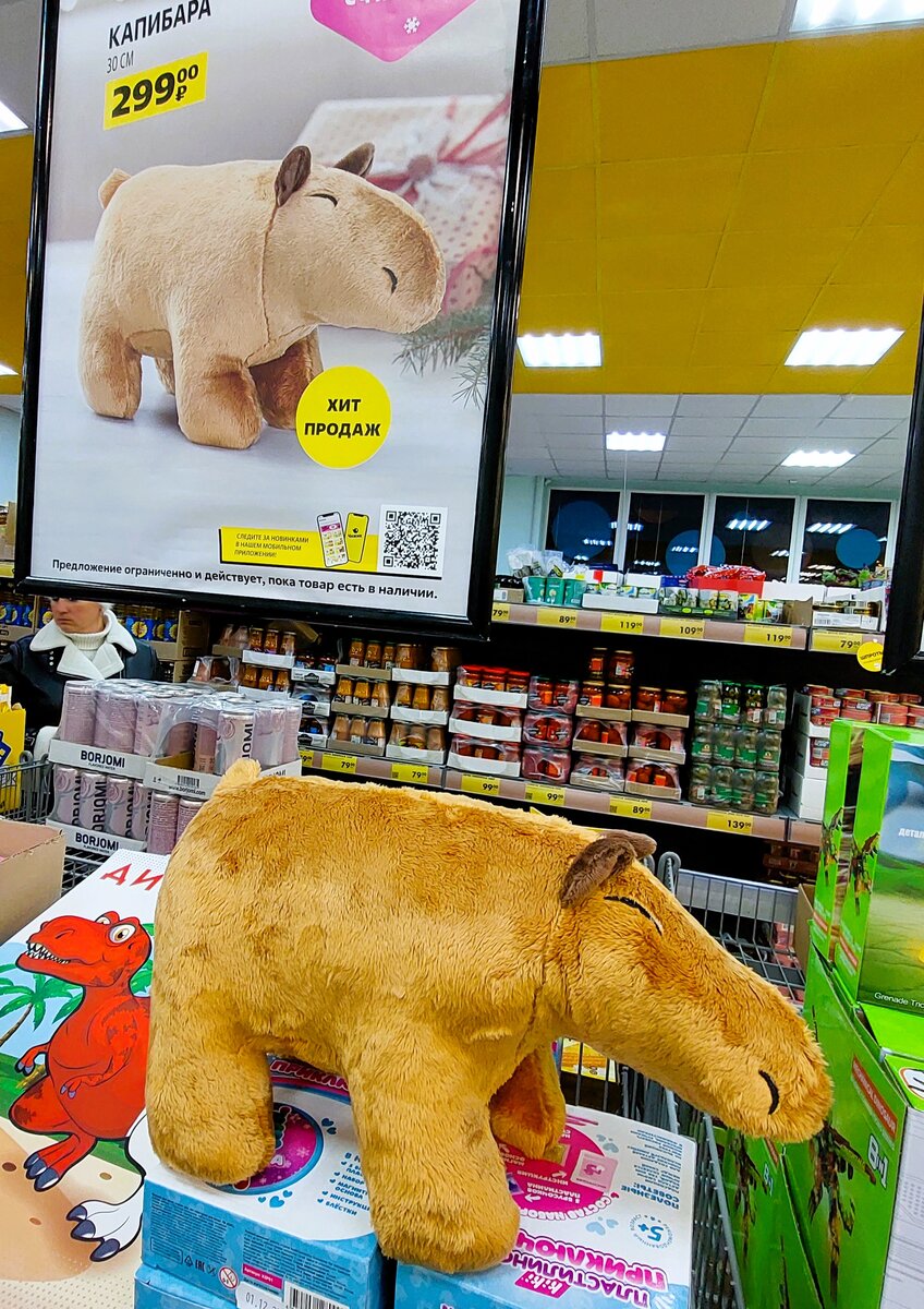 Приветствую всех заглянувших! Пришла в Чижик за термосом с широким горлом, но не купила и поясню почему. А для начала про другую новинку! Это ж надо было так отстать от жизни! Представьте себе, я не знала ничего про Капибару, пока не увидела ее в Чижике! Сначала посмотрела на плакат, читаю - Хит продаж! Ничего себе! С виду вроде ничего - симпатичная, добродушная. Потом в руки взяла. Мягкая, приятная на ощупь и слегка пушистая. Цвет янтарного песка. Изготовлена в Китае Оказывается Капибары сейчас очень популярны в Интернете, благодаря своим невозмутимым мордочкам. А вы тоже не знали про Капибару? Это самый крупный из травоядных млекопитающих на планете. Длина её тела более 1 метра, высота выше полуметра, а вес до 75 кг. В общем мне понравилась эта самая Капибара! И не только мне, увидела, как молодая женщина понесла на кассу игрушку. Купила, наверное, своим маленьким деткам. Цена 299 руб. Осталось их не так много в наличии, успевайте! Раскупят в минуту этого симпатягу! Термос с широ