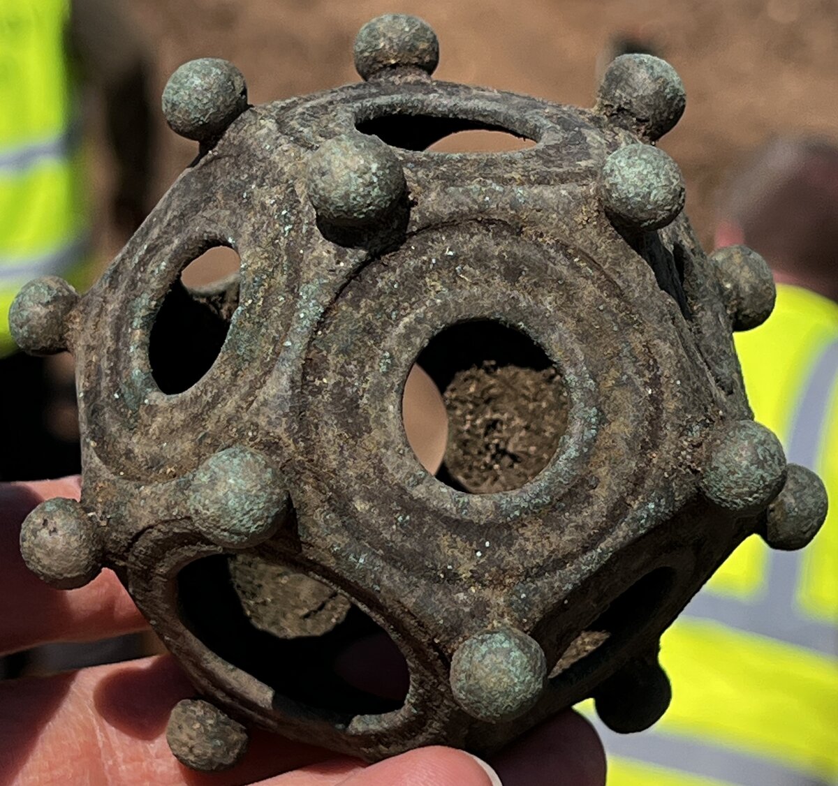 ... недалеко от деревни Нортон-Дисней на востоке Англии. Функция предмета является предметом споров. В руках археологов находится около 130 странных додекаэдров — полых бронзовых изделий, найденных в северных и западных провинциях Римской империи. На территории Англии нашли порядка 30 таких предметов. До сих пор ни одного додекаэдра не удалось обнаружить в Риме, и нет никаких упоминаний о подобных изделиях в древних текстах, надписях, фресках, мозаиках или каких-либо других источниках. Назначение бронзовых додекаэдров остаётся неизвестным. Находки бывают разного размера, «от мяча для гольфа до бейсбольного мяча», все они снабжены отверстиями на каждой из 12 пятиугольных граней; на каждом углу имеются шарообразные выступы. Этот предмет нашли прошлым летом при археологических работах в яме, возможно, оставшейся от карьера, вместе с фрагментами римской керамики. Артефакт полностью сохранился, он весит 250 граммов, его ширина 8 см, что много для подобных изделий. Какими бы редкими ни бы