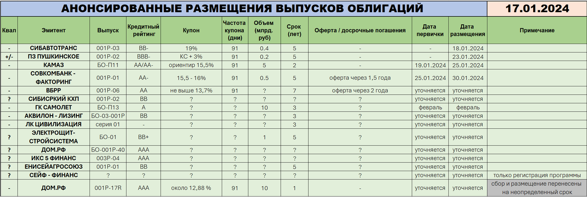 ОБЛИГАЦИОННЫЙ ВЕСТНИК 1️⃣7️⃣🔸0️⃣1️⃣🔸2️⃣0️⃣2️⃣4️⃣ ✌️ Добрый вечер, дорогие читатели! Экватор рабочей недели миновал, самое время подвести итоги этого прекрасного дня. К событиям, вперед! ---------- 🆕 НОВЫЕ РАЗМЕЩЕНИЯ / АНОНСЫ: ❄️ ПЗ ПУШКИНСКОЕ, столь любимое на рынке, возвращается с параметрами нового выпуска, регистрация которого была еще в прошлом году. На наши кошельки претендуют 200 миллионов рублей на 5 лет без оферты. Сладко, да не совсем - купонная ставка зависит от ключевой, а определяется оно как КС предшествующий дате начала соответствующего купонного периода + 3%. Чуть подробнее о возможных вариантах и последствиях расскажу в день релиза, но мне кажется, что прошлый выпуск 001Р-01 $RU000A107761 с фиксированной ставкой 18% смотрится отлично и сейчас, если бы не цена :) Размещение состоится 23 января, предварительного сбора заявок ждать не стоит. ❄️ МИНИСТЕРСТВО ФИНАНСОВ сообщает о том, что аукцион по ОФЗ 52005 $SU52005RMFS4, запланированный на сегодня, не состоялся. Неу