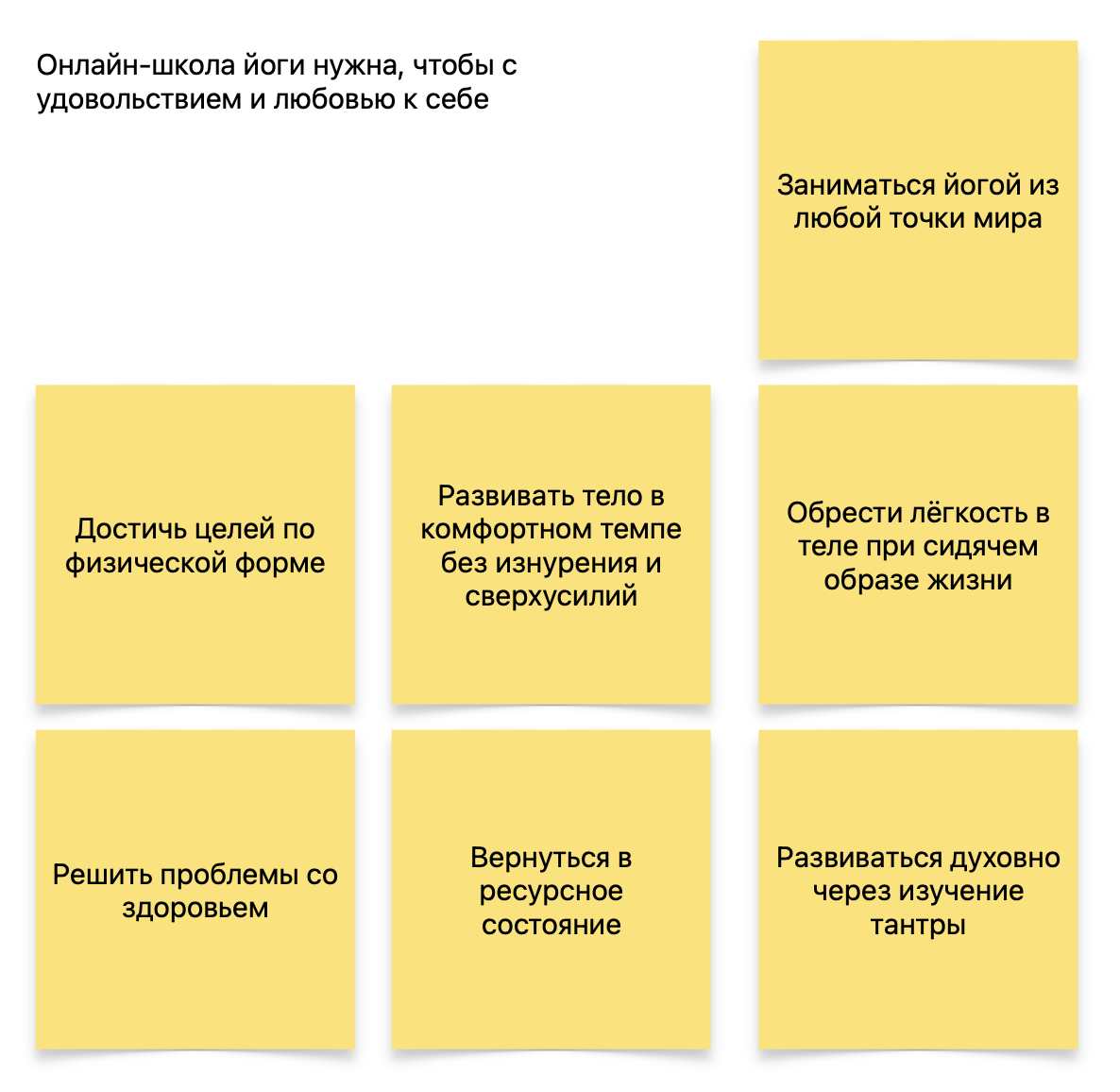 Проведя глубинные интервью и кабинетные исследования, Надя выписала несколько гипотез о том, зачем людям может быть нужна онлайн-школа йоги.