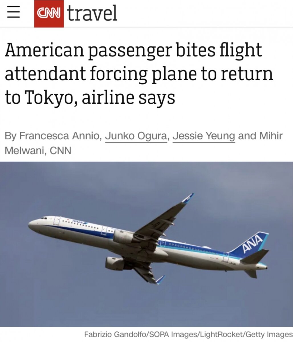 Пассажир американской авиакомпании укусил стюардессу во время полета, вынудив рейс All Nippon Airways (ANA), направлявшийся в Сиэтл, вернуться в Токио, Япония. Об этом сообщает CNN со ссылкой на представителя авиакомпании. По данным сайта отслеживания рейсов Flightradar24, рейс ANA 118 вылетел накануне из токийского аэропорта Ханэда в 21:47 по местному времени и развернулся чуть более чем через час после начала полета. Дебошир был задержан полицией после того, как самолет приземлился в японской столице, сообщили в авиакомпании. Ещё по теме Стюардесса получила легкие травмы, сообщили в пресс-службе. Это не первый случай, когда пассажиры кусались в самолетах. В 2022 году два пассажира были оштрафованы за то, что ударили и покусали членов экипажа и других пассажиров на рейсах американских авиакомпаний American Airlines и Delta Air Lines. Они были оштрафованы на 81 950 и 77 272 доллара соответственно. Это два крупнейших штрафа, когда-либо наложенных Федеральным управлением гражданской авиа