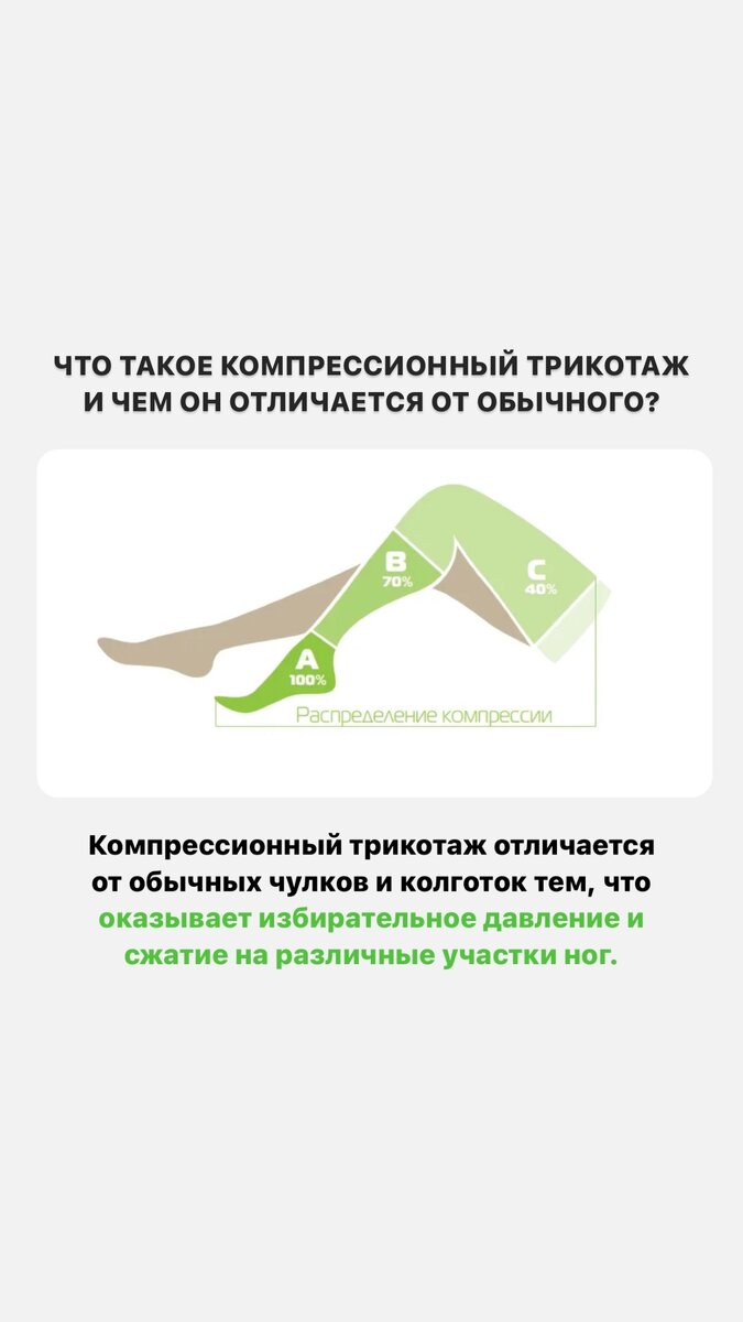 Сжатие и давление - это главное. А зачем это? Сейчас объясним! Компрессионный трикотаж отличается от обычных чулков и колготок тем, что оказывает избирательное давление и сжатие на различные участки ног. У человека есть глубокие вены (по ним течет 95-97% крови) и поверхностные вены (по ним течет остальные 3-5% крови). В норме кровь течет от ног к сердцу, в этом ей помогают клапаны, они не дают крови падать вниз. Варикоз - это когда в ПОВЕРХНОСТНЫХ венах ломаются клапаны, и часть крови начинает течь вниз, вместо того, чтобы течь вверх. Из-за этого вена расширяется, появляются боли, тяжесть, выпирающие вены и другие симптомы. т.е. движение крови нарушается в ПОВЕРХНОСТНЫХ венах. Когда же мы надеваем компрессионный трикотаж - мы оказываем давление на ГЛУБОКИЕ вены (НЕ НА ПОВЕРХНОСТНЫЕ) и усиливаем в них кровоток. за счет чего ПОВЕРХНОСТНАЯ вена со сломанным клапаном сужается и туда попадает меньше крови. За счет этих процессов уходят такие симптомы как боли, тяжесть и отеки. Компрессио