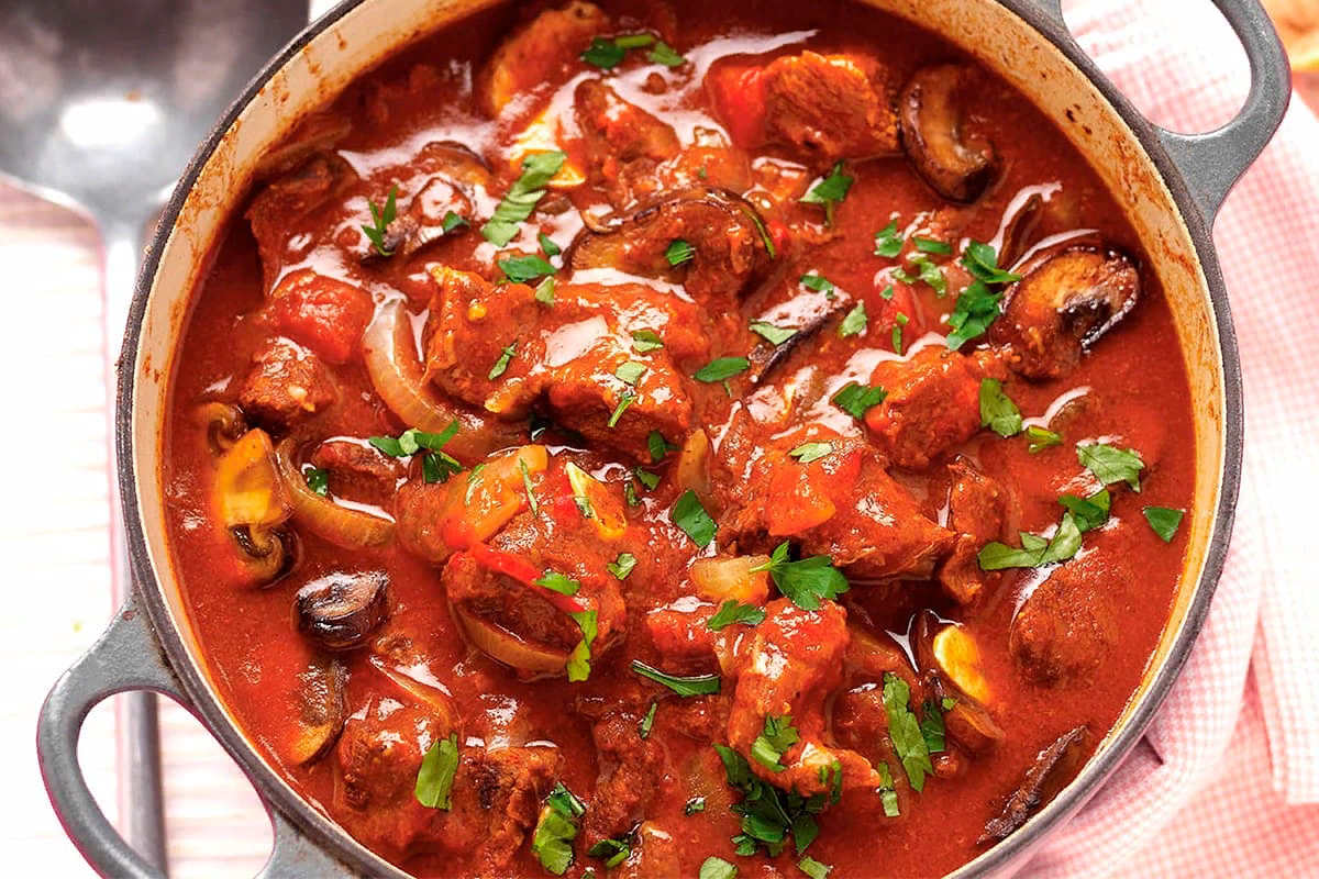 Гуляш из свинины с томатной подливкой – классический рецепт на сковороде