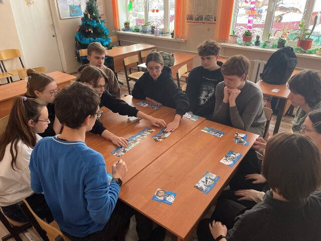 «Ваше дело живёт», – отрапортовал учитель истории первой боровской школы Александр ПАВЛОВ. Именно к нему мы отправились на тестовую игру и подарили рабочий комплект карточек. А уже 27 декабря он собрал старшеклассников на второй раунд.