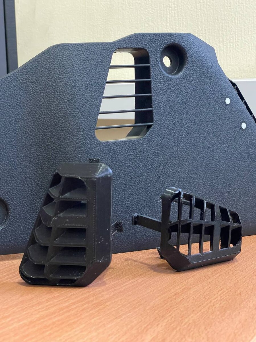Пример 3D-печати дефлектора печки в салоне авто для направления тёплого воздуха. Печать выполнена из пластика PETG на FDM принтере.