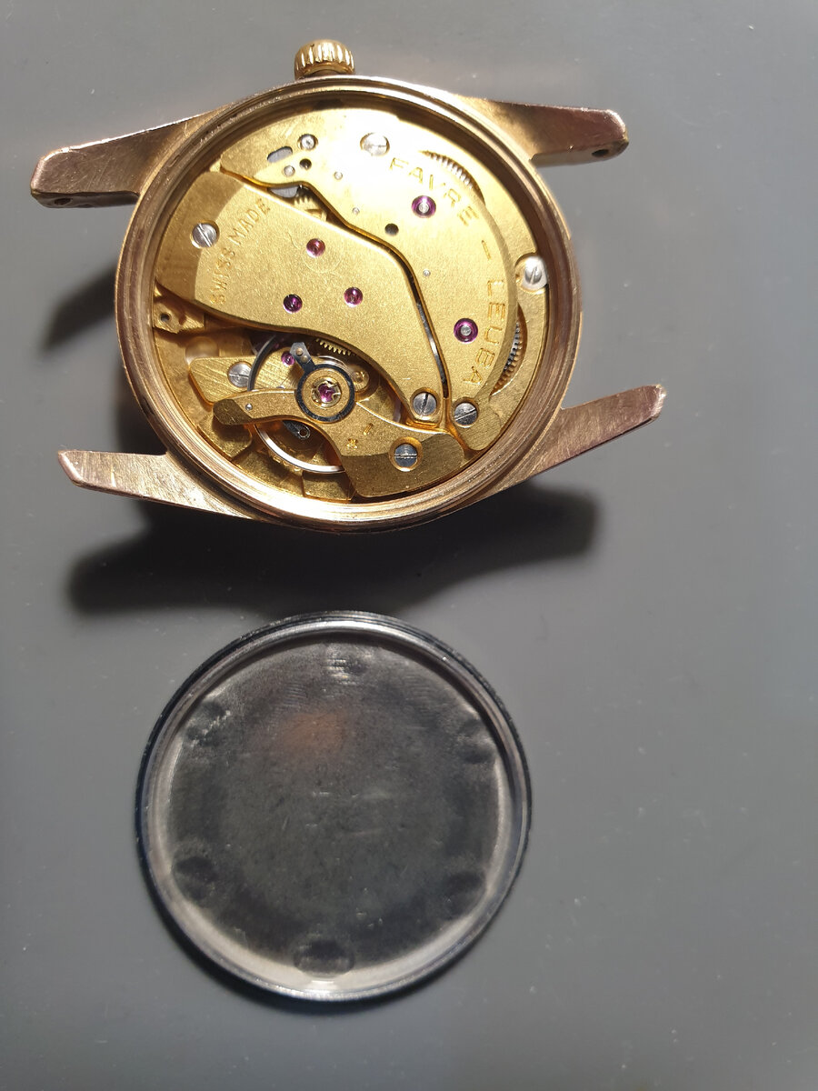 В ремонте оказались часы старейшей и знаменитой Favre Leuba (основана в 1737 году) из серии Sea King и с "Twin Power" механизмом. О самой фирме Favre Leuba я расскажу в другой статье, а пока конкретно об этом экземпляре. Это модель небольшого размера (31 мм в диаметре) из 60-х. Серия Sea King состояла из дайверских и водонепроницаемых часов, эти имеют позолоченный корпус и довольно классический дизайн. На фото часы уже почищены и собраны, пластиковое стекло отполировано, и за страшной запущенностью (фото которой к сожалению не осталось) раскрылось состояние весьма неплохого сохрана. Механизм был исправен, но в грязи, соответственно полная разборка, промывка деталей в бензине, затем в спирте (бензин оставляет следы на мостах и т.д.), хорошо прочищаем трибы колёс. Пружины, как и всё остальное впрочем, в хорошем состоянии. Пришлось только высверлить обломанный винт фиксации механизма в корпусе часов. Собираем всё обратно. Серии Sea King, Sea Chief и Sea Rider, были представлен