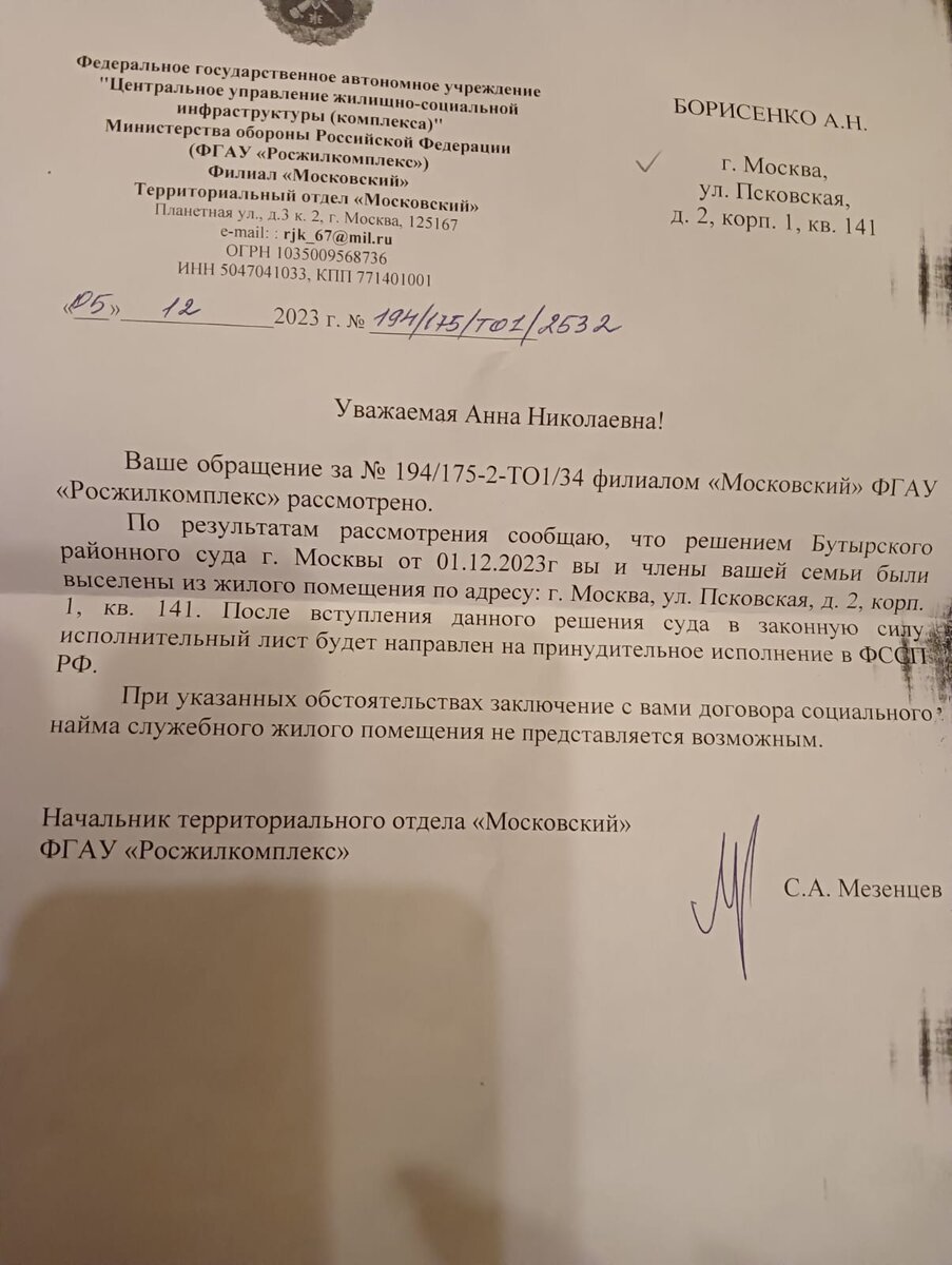 «И я была у врача, мне голову проверяли, там киста большая после инсульта, а они травлю устроили, письма угрожающие пишут, что выселят. Пишут и не обращают внимание на решение Хамовнического суда и на решение Мосгорсуда. Говорят, выселят сразу же после того, как решение суда первой инстанции выйдет в письменном виде. Мы на апелляцию будем подавать – это их не волнует. Нервничать нельзя - врачи говорят, а как же не нервничать в такой ситуации», – рассказывает Анна Николаевна Борисенко. В настоящий момент она вынуждена одновременно проходить комиссию по установлению второй группы инвалидности и бороться за крышу над головой. Отметим, что семья военнослужащего Борисенко получила жильё по адресу - Москва, ул. Псковская 2, к. 1, кв. 141 в 94 году. Теперь бывшую жену военнослужащего гонят на улицу. Причём, заявляют, что изначально семья вселилась самозахватом. Первый раз её пытались выселить в 2002 году. Однако суд факт самозахвата не признал, в выселении на улицу без предоставления другого
