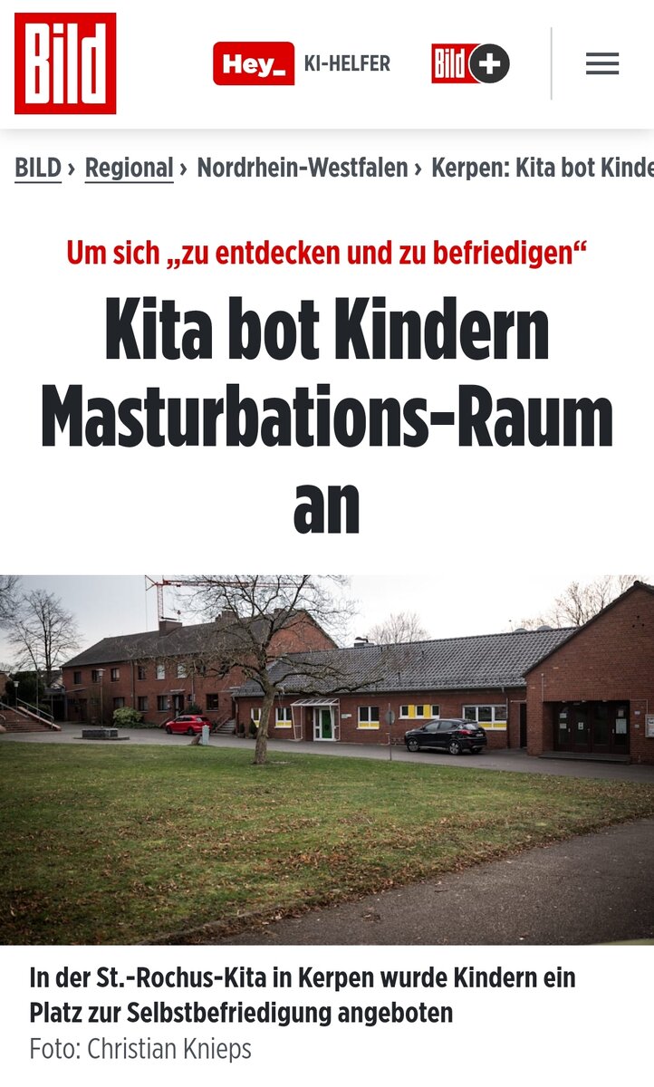 В Санкт-Рохус-Ките в Керпене детям предложили место для мастурбации. О чем думало руководство детского сада? В Керпенском детском саду Св. Рохуса детям, видимо, предлагали мастурбировать! В концепции сексуального воспитания было заявлено, что отдельные дети должны "уходить на пенсию в защищенное пространство в соответствии со своими потребностями, чтобы открыть для себя и удовлетворить себя физически. (это не допускается в общественных местах и в присутствии других лиц)". Эта концепция была размещена на веб-сайте детских садов, но впоследствии была удалена. Осмотр детского сада Сексуальная концепция учреждения, которую должен представить каждый детский сад в земле Северный Рейн Вестфалия, побудила власти к действию еще в ноябре. Несколько отделов по делам молодежи, руководство детских садов и архиепархия Кёльна в качестве спонсоров осмотрели детский сад. Пресс-секретарь города: "Ни расположение самого детского сада, ни впечатление, полученное во время встречи на месте, не остав