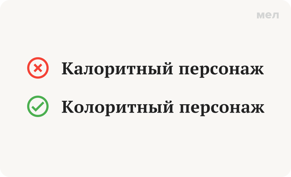 Что значит прилагательное «колоритный», какие у него корни и с каким словом латинского происхождения его можно перепутать — решаем проблему колоритности и калорийности. Правильно: колоритный персонаж Сверхпопулярность этой неочевидной, в общем-то, ошибки кроется в похожести двух латинских слов, прижившихся в русском языке: color и calor. Color — это «цвет», а calor — «жар» или «зной». От первого латинского слова происходит русское прилагательное «колоритный» (красочный, цветной, яркий, отличающийся определенными, бросающимися в глаза качествами), от второго — «калорийный» (содержащий значительное число калорий, питательный). В связи с тем, что оба они заимствованные, их правописание объясняется не правилами русского языка, а тем, как пишутся слова, от которых они произошли. Первая гласная в слове color — «о», первая гласная в слове calor — «а». Это же правило сохраняется и в русском — «кОлоритный», но «кАлорийный». По традиции несколько примеров для запоминания: Еще больше веселых и по
