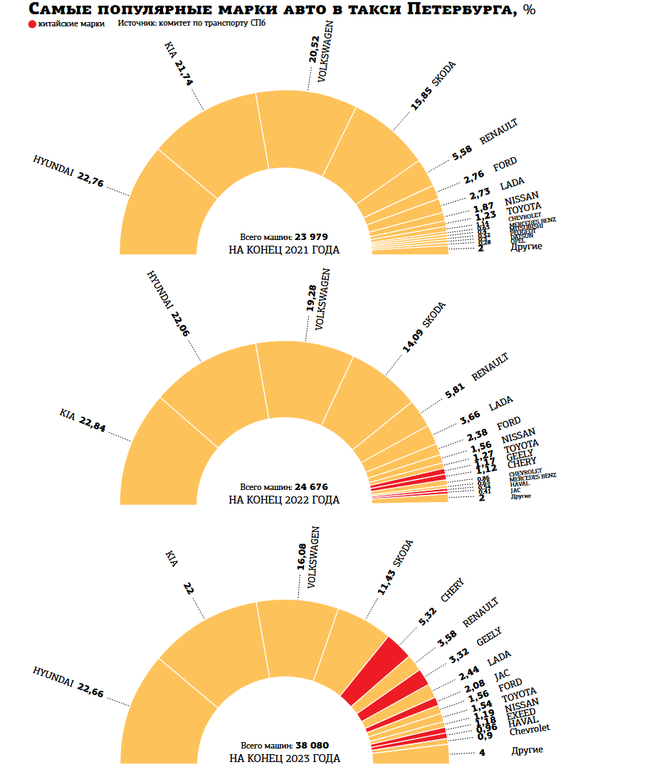 На два самых узнаваемых корейских бренда приходится 44,7% рынка: долю 22,7% с 8,6 тыс. авто занимает Hyundai, KIA — соответственно, 22% с 8,34 тыс. авто. Такси с логотипом Volkswagen в Петербурге чуть более 6,1 тыс., или 16%, ещё 4,35 тыс. (или 11,4%) автомобилей Skoda. Совокупно они занимают более 72% рынка.