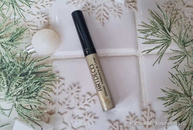 Зимой так хочется сияния, которое будет видно из космоса. Мое настроение сейчас «больше- больше блесток, спарклов и глиттера»! Это была абсолютно спонтанная покупка, я зашла в магазин забрать заказ и решила пройтись… Взгляд упал на новогоднюю коллекцию немецкого бренда Artdeco, а ручки-загребучки уже несли на кассу очередную прелесть! Данный лайнер представлен в двух оттенках: золото и серебро, я хотела два, потом мне удалось взять себя в руки. Жаба победила хомяка. Тушь-лайнер — это продукт 2 в 1, представляет собой прозрачную базу с мелким золотым глиттером. Продукт прекрасно упакован в плотную слюду. Объем 6 мл. Кисточка представляет собой пластиковую спираль (тушь) и кисточку (лайнер). Из недостатов сразу выделю кисточку, она достаточно толстая и тонкую красивую линию провести ей весьма сложно. Кисть туши слипляет ресницы. На руке яркое и красивое сияние, выглядит плотненько. На деле я наносила на черную подводку в качестве топа и на черную тушь для ресниц. Мне не хватило сияния и